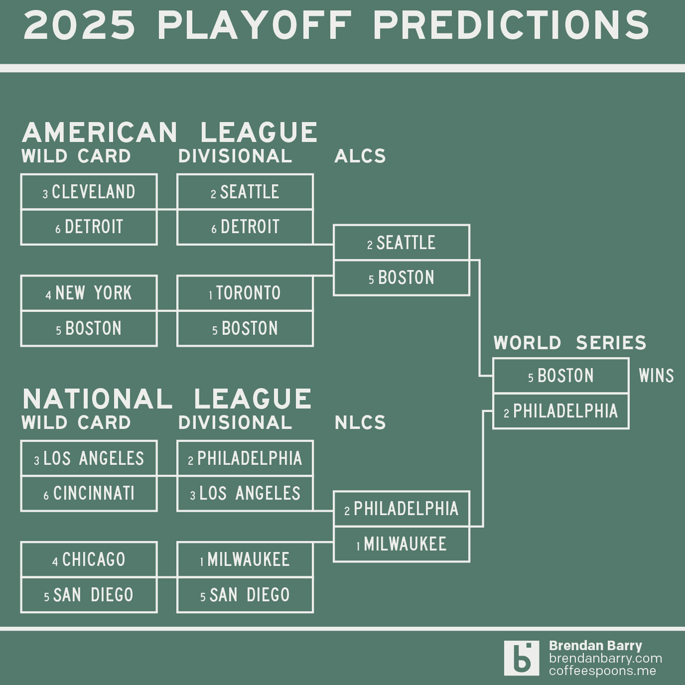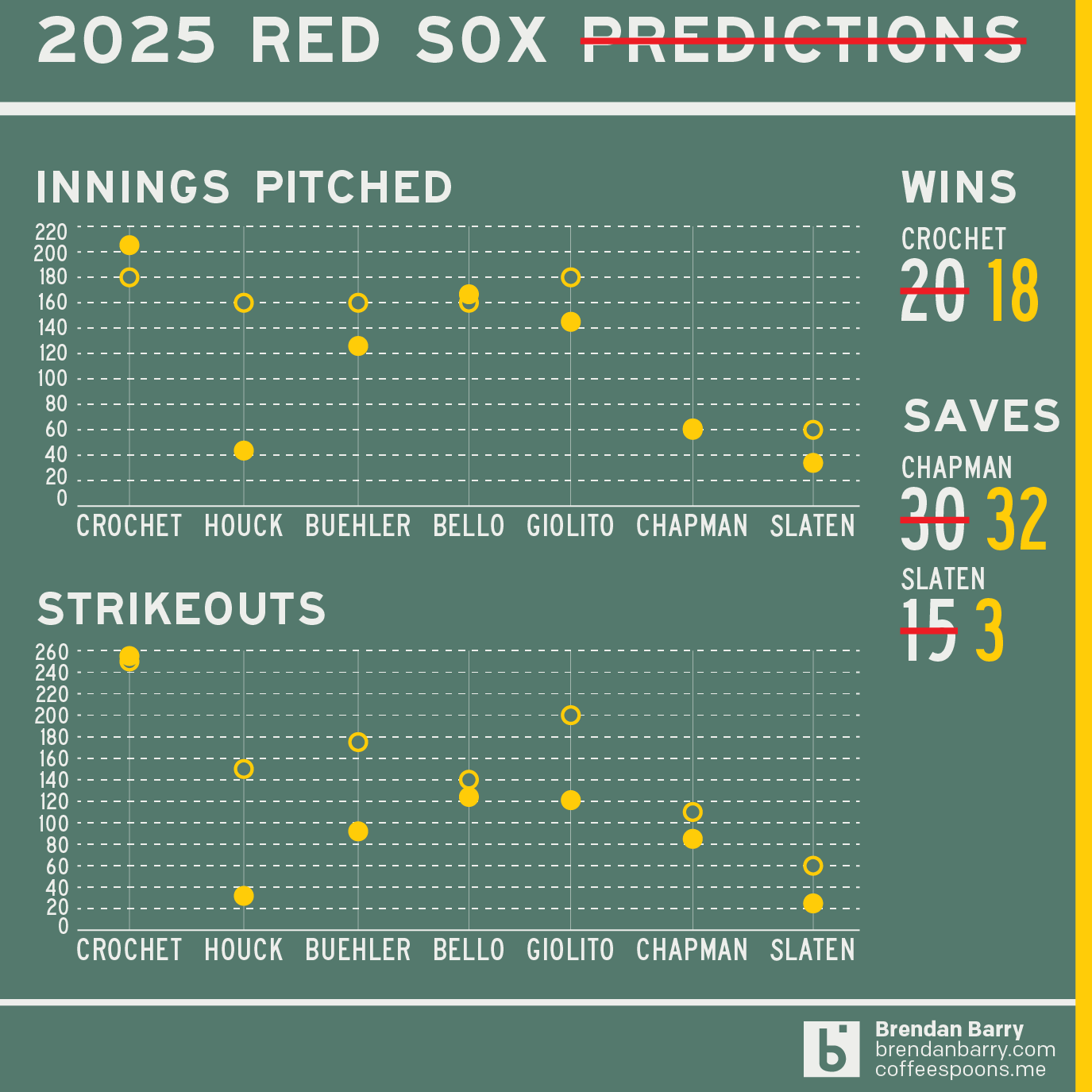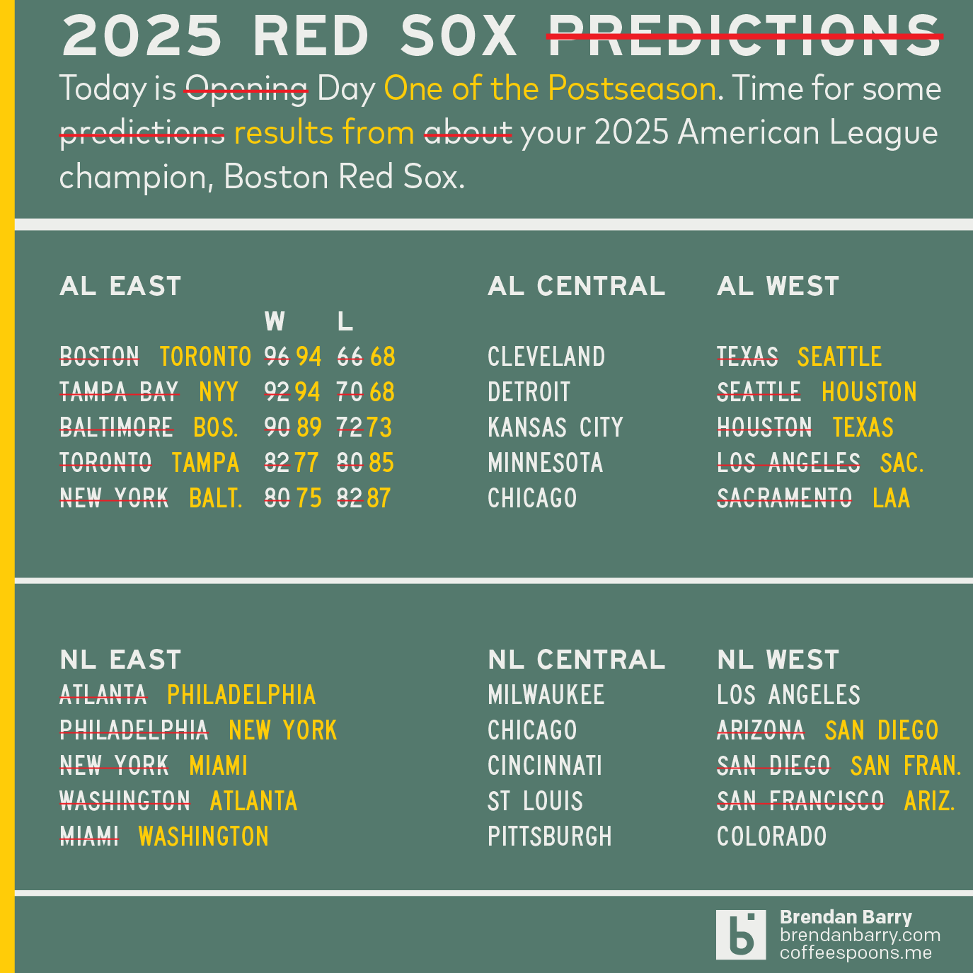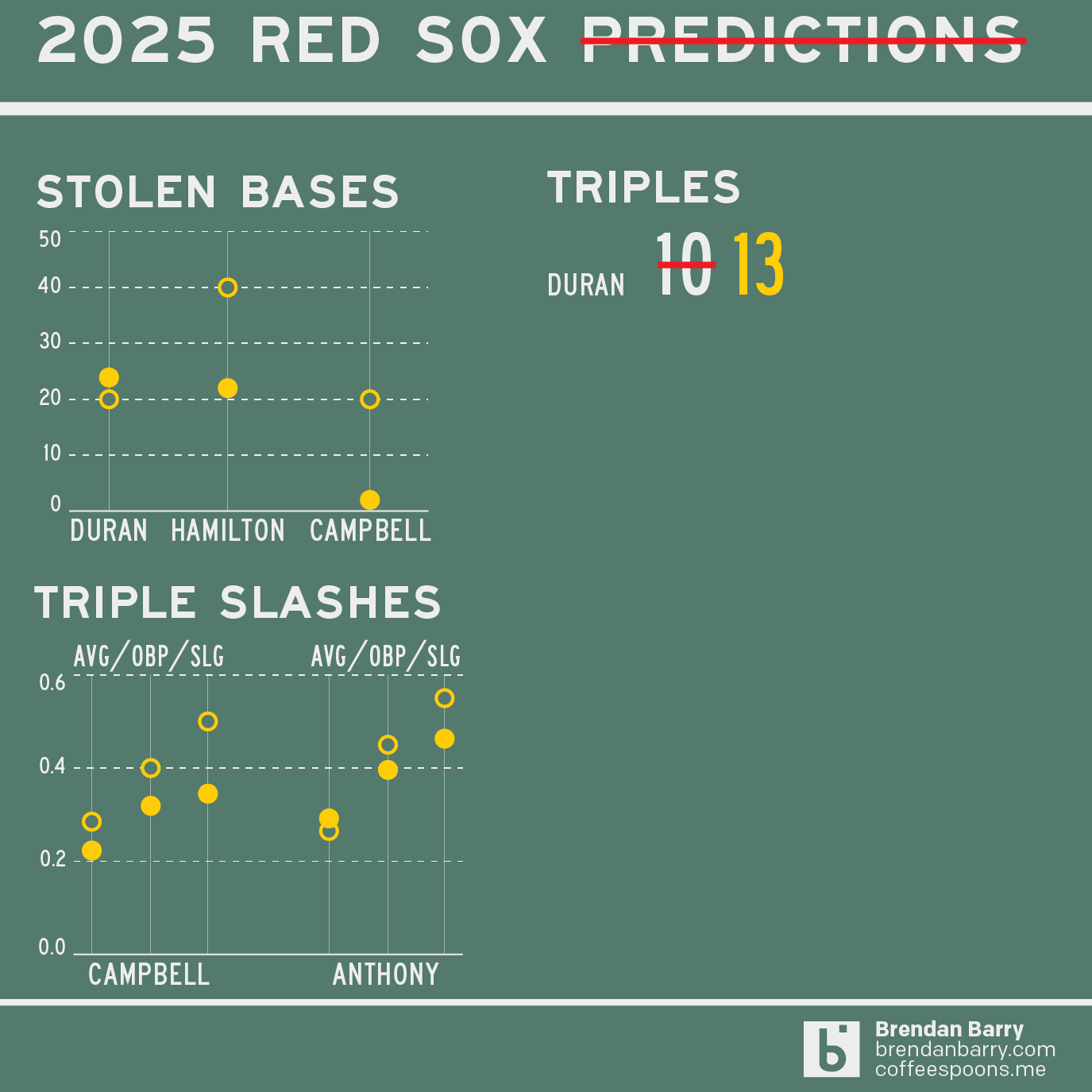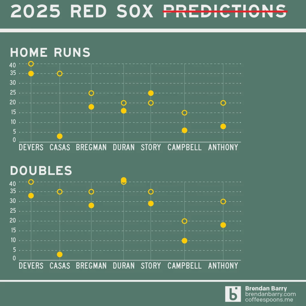 Back in March I posted my predictions for the 2025 Boston Red Sox on my social media feeds. I chose not to post it here, because the images had no real data visualisation and the only real information graphic was my prediction of the playoffs via a bracket. I did, however, write about how the Sox may have found their second baseman of the future in Kristian Campbell.