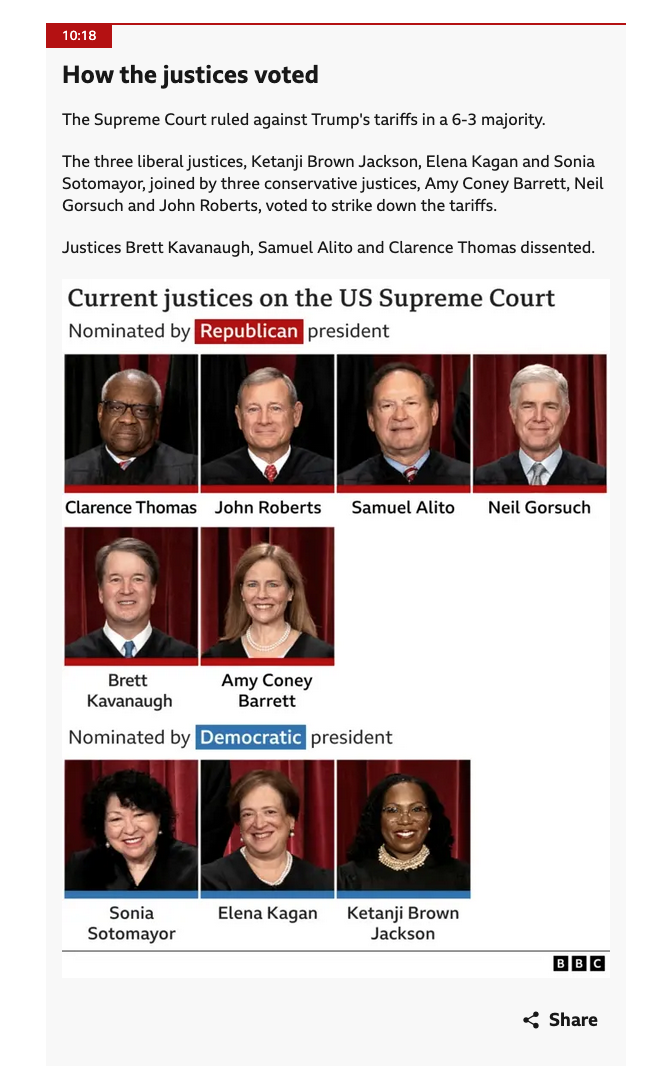 Contextually, I already knew the decision was 6–3 against the tariffs. At first glance I see six boxes above and three boxes below. Ah, the votes in favour and the votes against. Reading a bit more closely as I focus on the article, I see the graphic’s header: Current Justices on the Supreme Court.