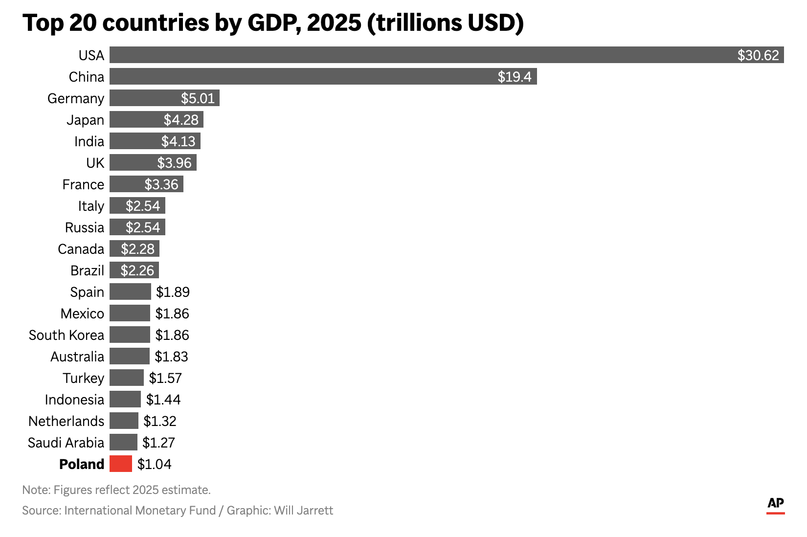 At first glance, these are fine. Bar charts highlighting Poland in red. But when I read more closely, I noticed there were no axis lines. No axis labels. Instead, the designer labelled every individual bar. As if the critical knowledge were that Spain’s GDP was $1.89 tn vs. Mexico’s $1.86 tn. Spoiler: that is not critical.