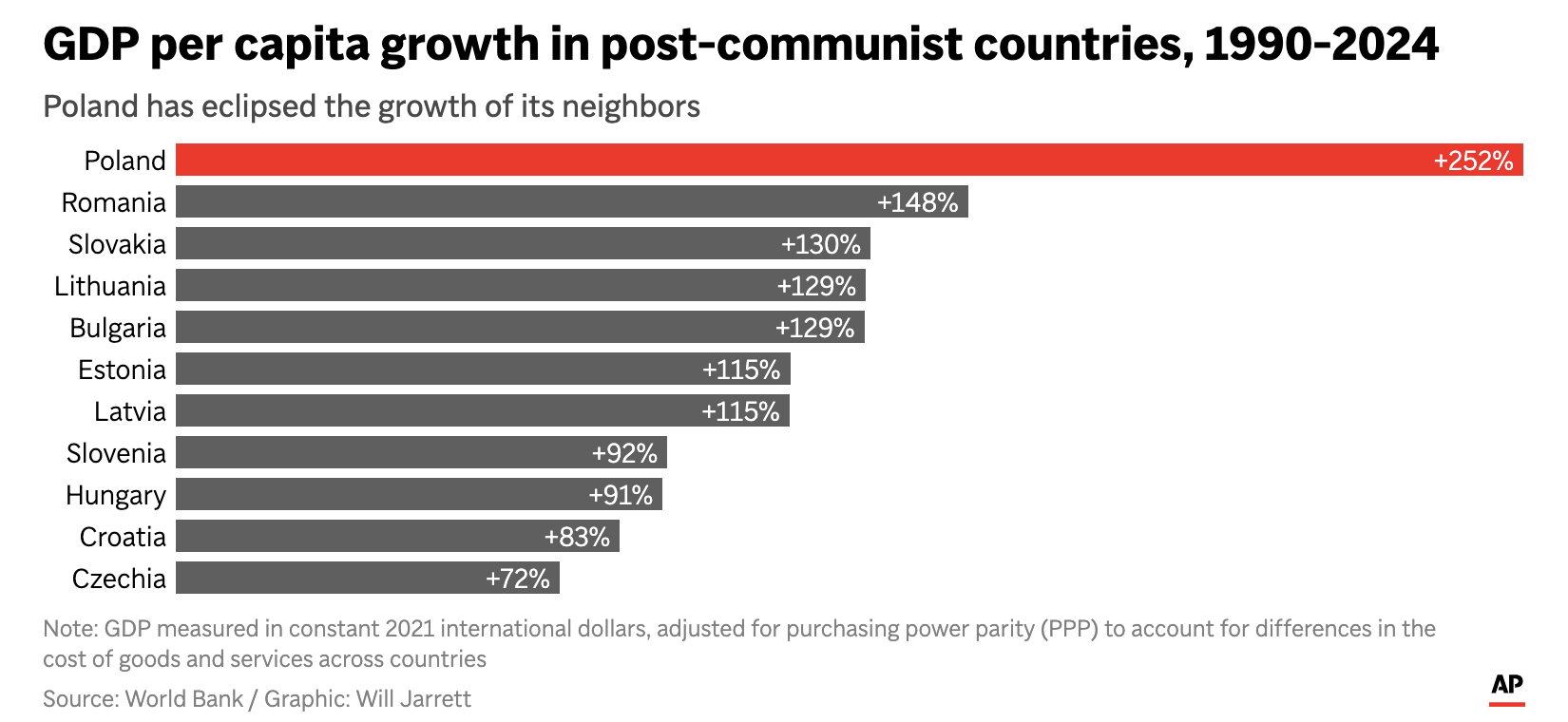On the data side, I had a minor issue too. The second graphic looked as post-communist countries, but I could find neither rhyme nor reason as to how the countries were selected. A list of post-communist countries would surely include Russia, no? Perhaps it was excluding the former Soviet Union countries? But then Estonia, Latvia, and Lithuania are right there. But missing are Georgia, Armenia, Azerbaijan, et al. If it is supposed to limit itself to non-Russia, eastern European countries, where are the former states of communist Yugoslavia? It is just an odd selection of states to include and leaves that little bit of doubt as to whether the set was cherry picked to leave Poland at the head of the class.